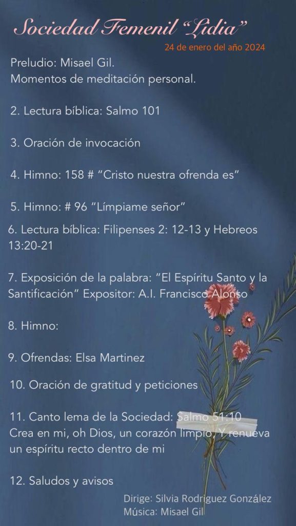 Sociedad Femenil Lidia – 24 de enero, 2024 enero 24, 20244040 Views Dios mediante la reunión se llevará a cabo presencial y en línea, las esperamos Acceso a Reunión Virtual Zoom de hoy (5:00 pm – Ciudad de México): Unirse a la reunión Zoom ID de reunión: 88024930543Código de acceso: 582319 Comparte con tus amigos