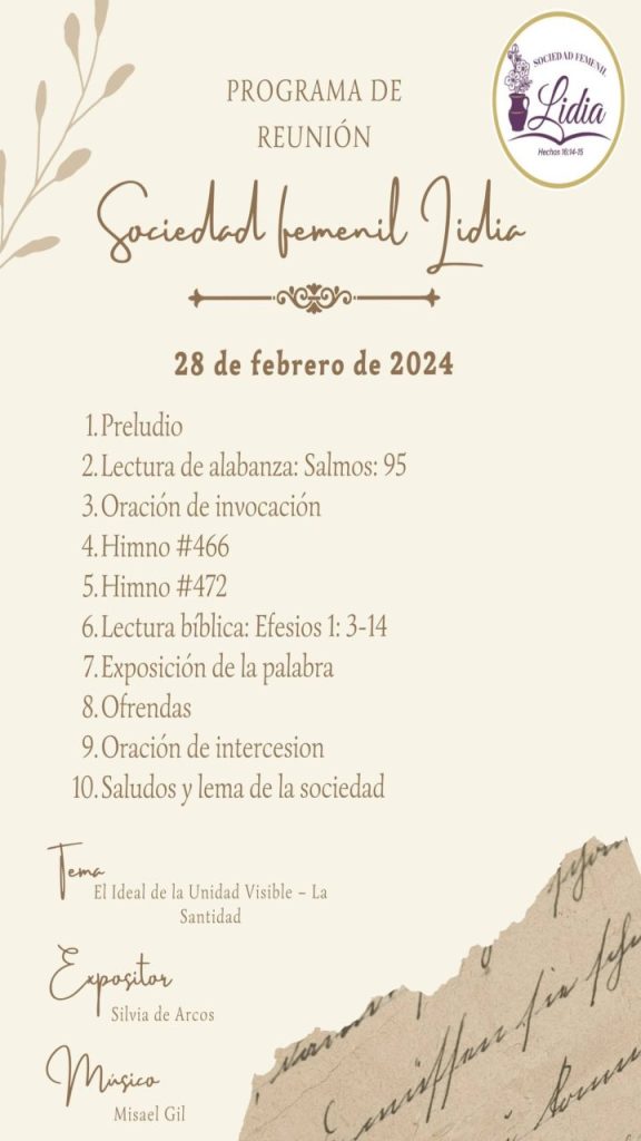 Sociedad Femenil Lidia – 28 de febrero, 2024 febrero 28, 20244469 Views Dios mediante la reunión se llevará a cabo presencial y en línea, las esperamos Acceso a Reunión Virtual Zoom de hoy (5:00 pm – Ciudad de México): Unirse a la reunión Zoom ID de reunión: 88024930543Código de acceso: 582319 Comparte con tus amigos