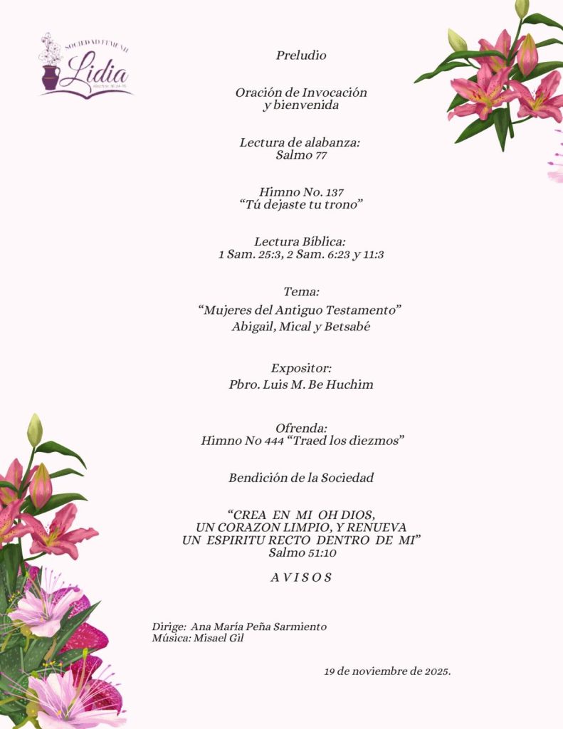 Sociedad Femenil Lidia – 19 de noviembre, 2025 noviembre 19, 20258274 Views Dios mediante la reunión se llevará a cabo presencial y en línea, las esperamos Acceso a Reunión Virtual Zoom de hoy (5:00 pm – Ciudad de México): Unirse a la reunión Zoom ID de reunión: 88024930543Código de acceso: 582319 Comparte con tus amigos