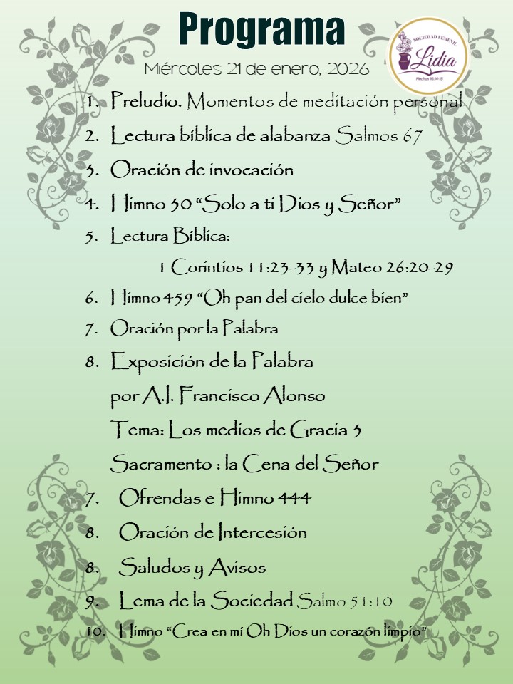 Sociedad Femenil Lidia – 21 de enero, 2026 enero 21, 20268656 Views Dios mediante la reunión se llevará a cabo presencial y en línea, las esperamos Acceso a Reunión Virtual Zoom de hoy (5:00 pm – Ciudad de México): Unirse a la reunión Zoom ID de reunión: 88024930543Código de acceso: 582319 Comparte con tus amigos