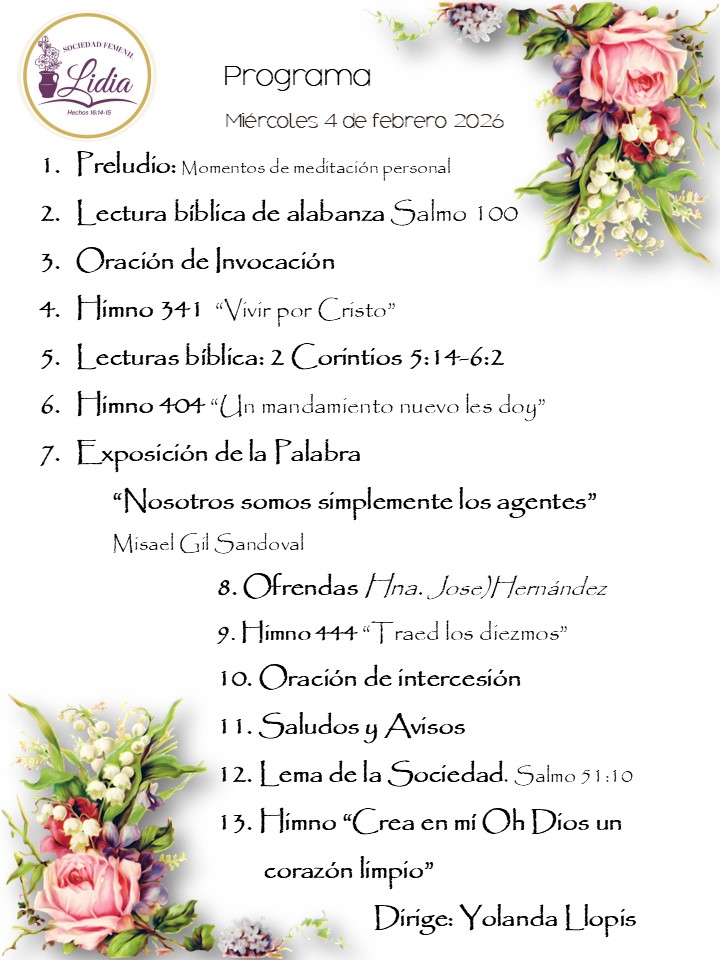 Sociedad Femenil Lidia – 4 de febrero, 2026 febrero 4, 20268878 Views Dios mediante la reunión se llevará a cabo presencial y en línea, las esperamos Acceso a Reunión Virtual Zoom de hoy (5:00 pm – Ciudad de México): Unirse a la reunión Zoom ID de reunión: 88024930543Código de acceso: 582319 Comparte con tus amigos